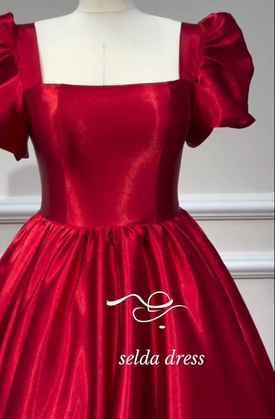 لباس مجلسی قرمز ساتن پفی با طراحی شیک و خاص، مناسب مهمانیها، تولد و مراسم رسمی. پارچه ساتن براق و دوخت حرفهای برای استایلی خیرهکننده و زنانه