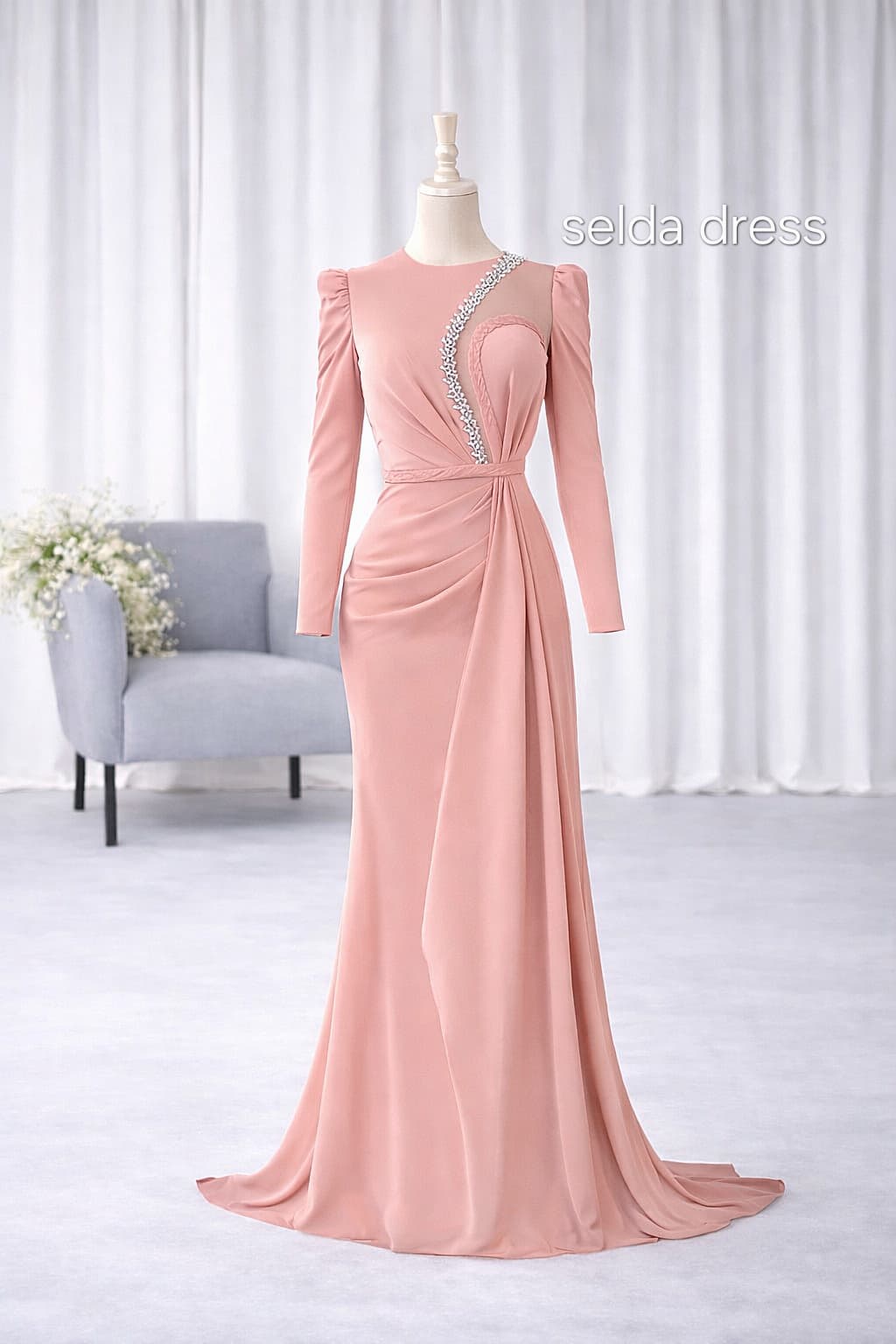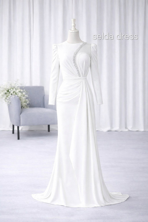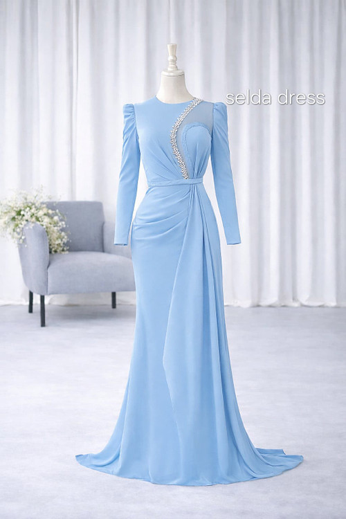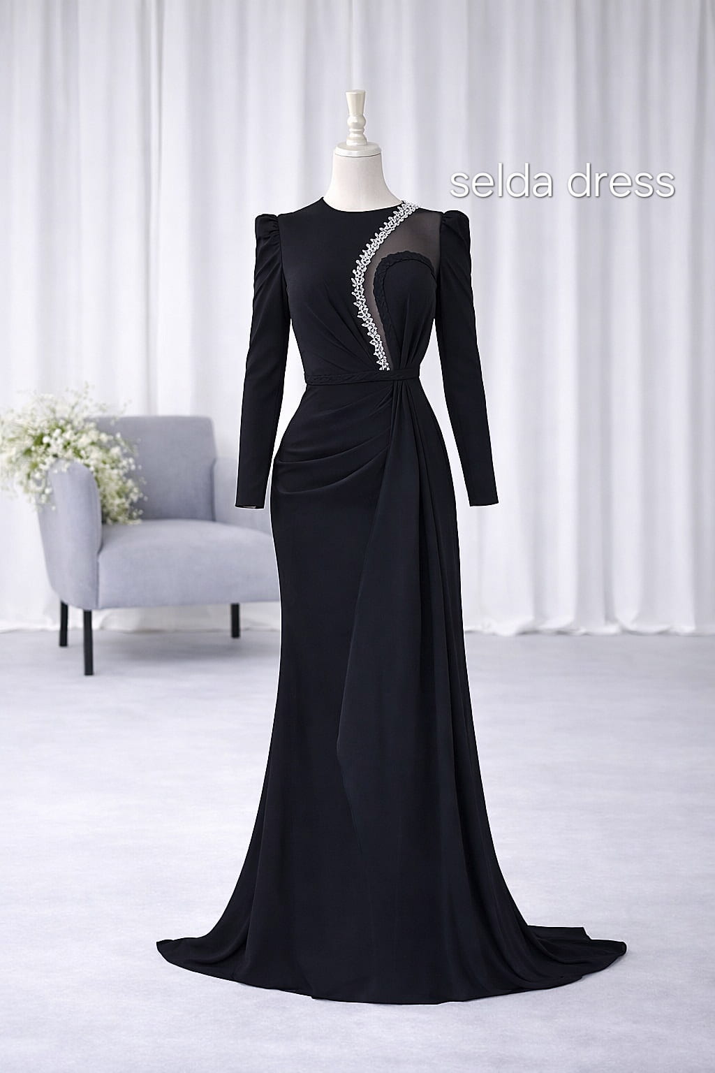 با لباس مجلسی مشکی سلدا درِس در مهمانیها بدرخشید. طراحی خاص با پارچه باکیفیت، آستین بلند و سنگدوزی ظریف روی بالاتنه، استایلی جذاب و اصیل برای مجالس رسمی و عروسی ایجاد میکند
