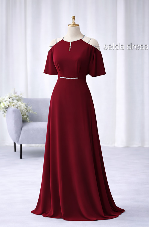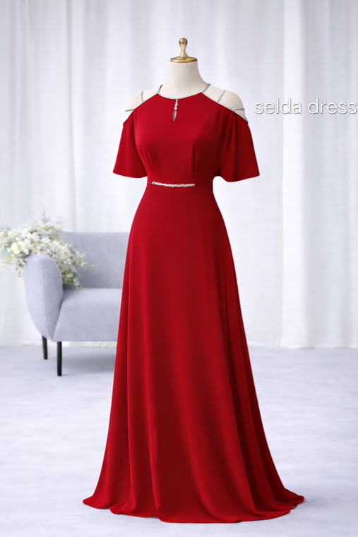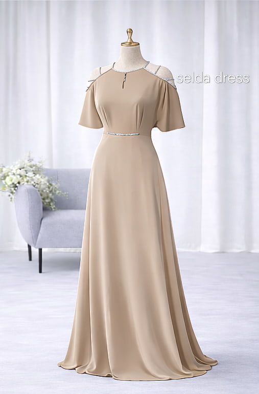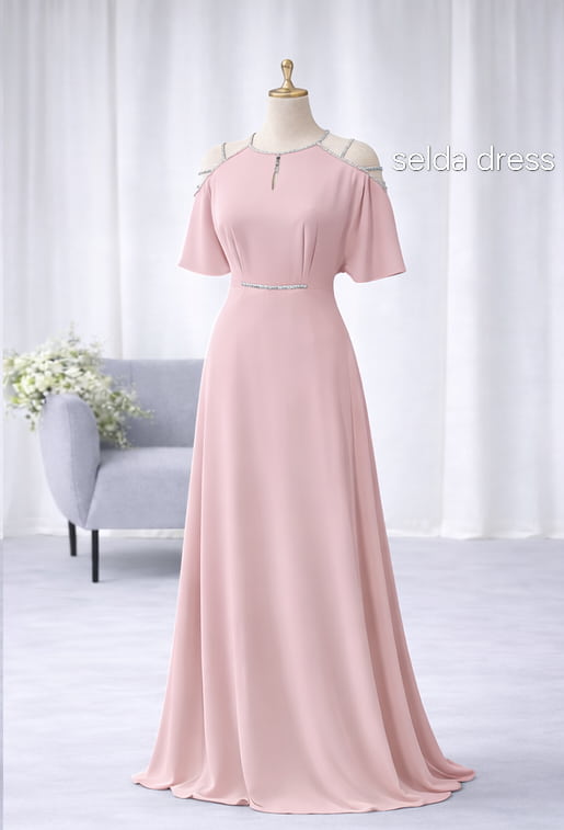 پارچه استفاده شده در این لباس سبک، لطیف و خوشریزش است که هنگام حرکت جلوهای زیبا و لوکس ایجاد میکند. کمربند ظریف نگینکاری شده در قسمت کمر نیز باعث تأکید بر فرم اندام شده و استایل را جذابتر میکند.