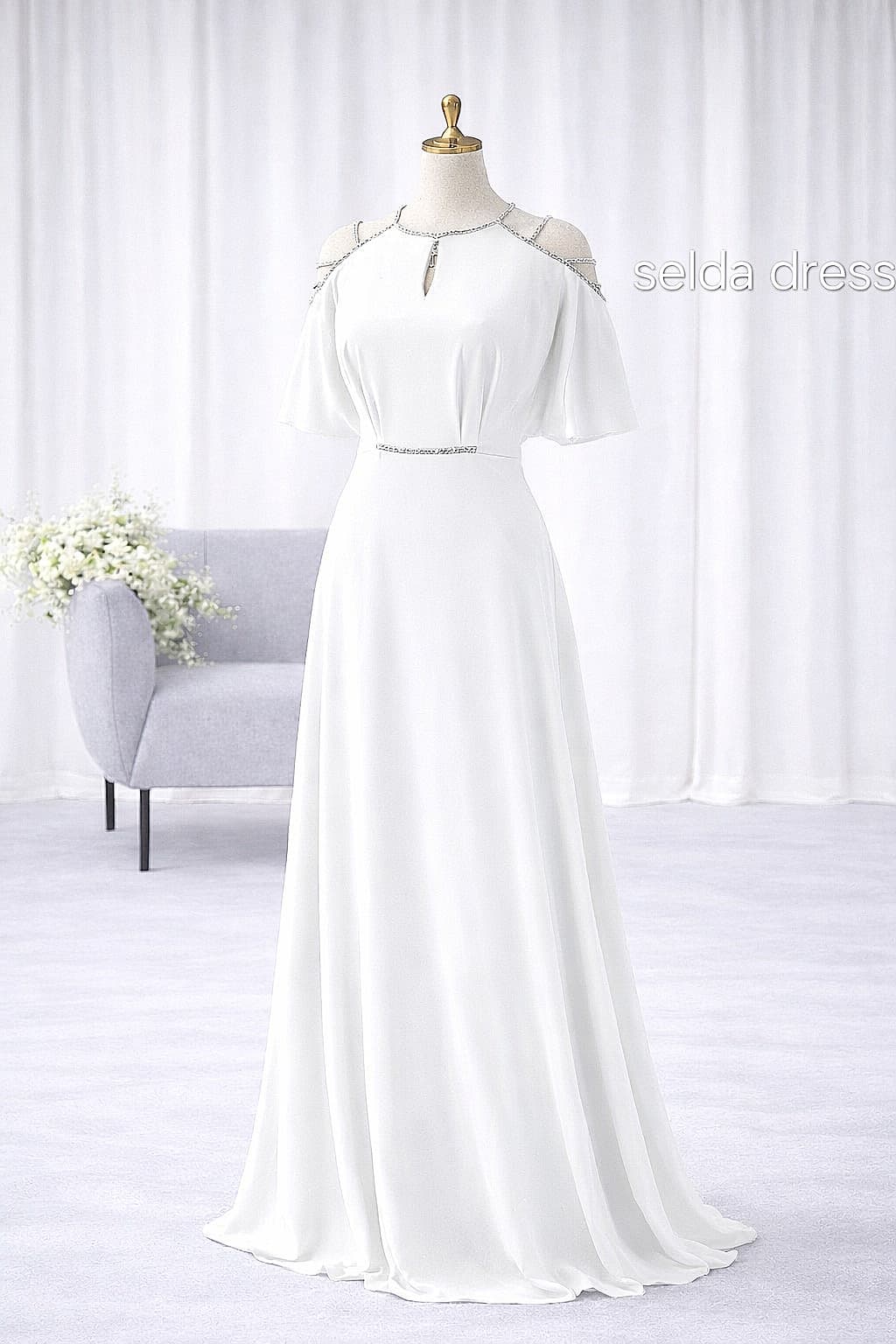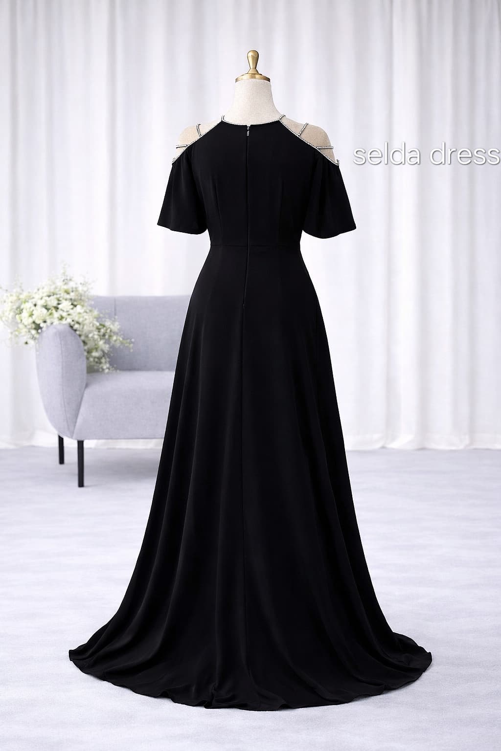 لباس مجلسی بلند مشکی زنانه جدید ۲۰۲۶ | مدل سرشانه باز نگیندوزی شده سلدا ۱۹۷۴
